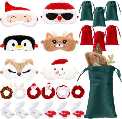 6 Set Christmas Sleep Mask with Satin Travel Bag Eye Mask Gift for Christmas Elastic Scrunchie Ear Plugs Plush Eye Cover Cartoon Animal Blindfold for Xmas Party Favor Home Bed Traveling