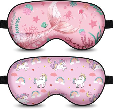 2 Pack Sleep Mask for Kids, Cute Unicorn Mermaid Blackout Sleeping Mask, Eye Cover with Adjustable Strap, Soft Eye Blindfold for Girls Teen Home Travel Party, Ocean Rainbow Animal Blindfold Pink