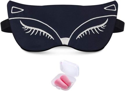 Silk Sleep Eye Mask Sleep Mask Fox Embroidered Soft Blindfold Eye Cover Eyeshade with Earplugs for Kids Men Women Plane Travel Nap Night Sleeping (Dark Blue)