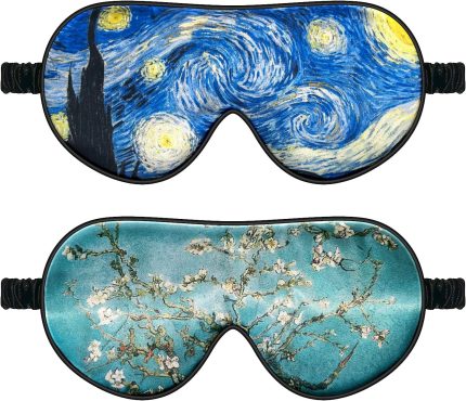 2 Pcs Silk Sleep Eye Mask with Elastic Strap/Headband Shade Art Eye Mask Zero Pressure on Eyelids & Eyelashes for Night Sleeping,Travel,Nap(Van Gogh Almond Blossoms & The Starry Night)