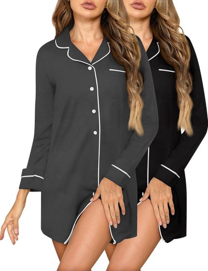 2 Pack Women Nightgowns Button Down Sleepwear Soft Long Sleeve Pajama Women Nightdress V Shaped Neck Sleep Shirts