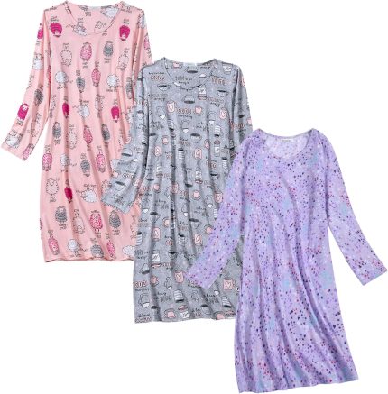 3 Pack Nightgowns for Women Soft Cotton Print Sleepshirts Womens Long Sleeve Sleep Tee Sleepwear