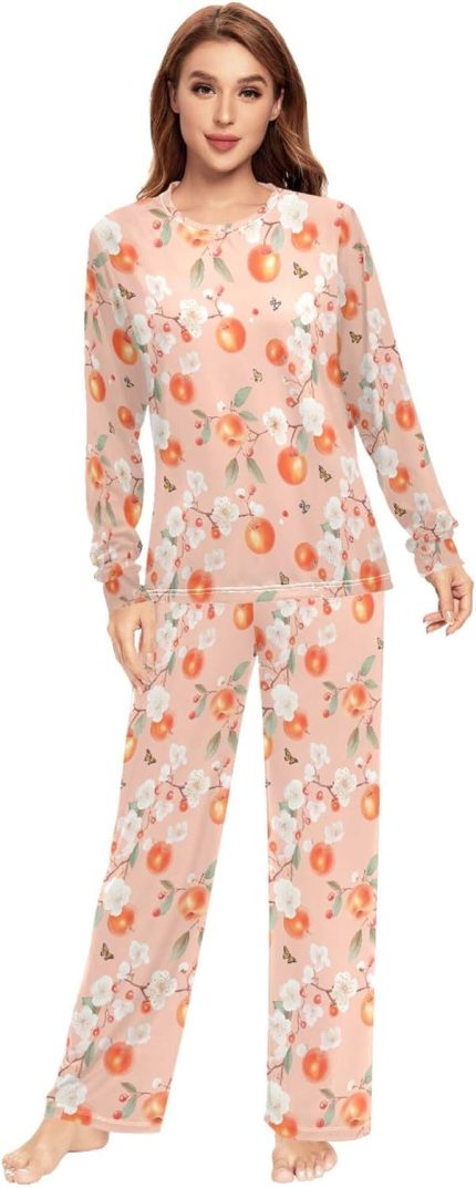 Cute Serviceberry Fruit Peach Pajamas for Women Sets 2 Piece Comfy Men Sleep Pants Lounge Sets