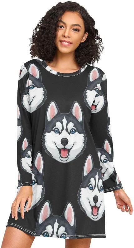 Cute Dogs Black Womens Night Shirts, Long Sleeve Nightgowns for Women, Loose Sleep Dress for Fall Winter