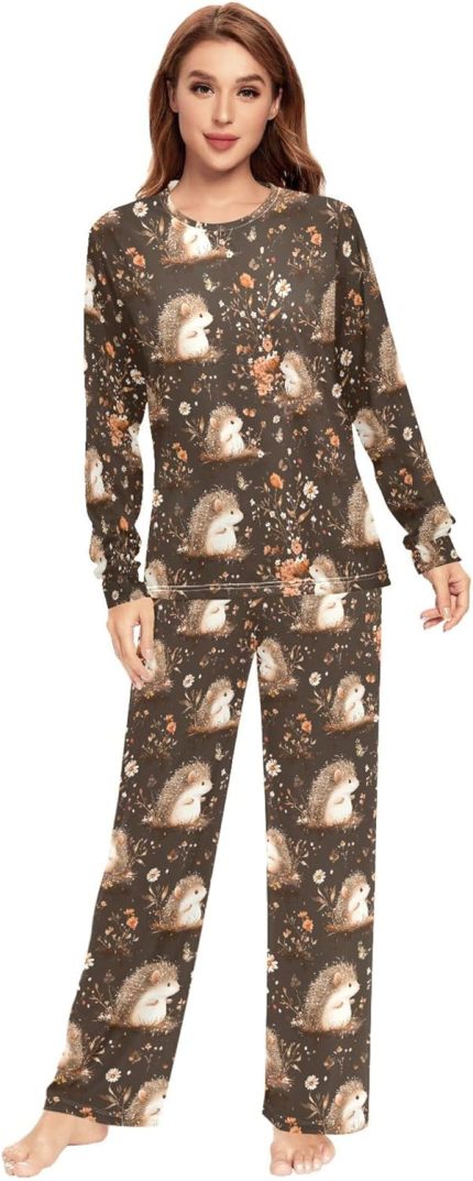 Cute Hedgehog Brown Pajamas Sets for Women 2 Piece Comfy Men Sleep Pants Loungewear for Family Xmas Pjs
