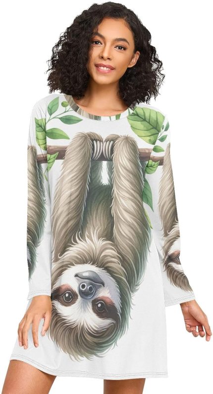 Cute Sloth White Long Sleeve Night Shirts for Women, Cozy Crewneck Sleep Dress, Casual Womens Nightgowns
