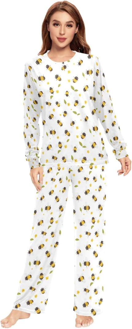 Cute Bees White Pajama Sets for Women 2 Piece Warm Men Sleep Pants Jammies