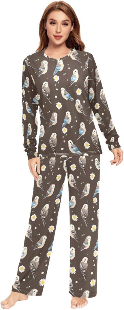 Cute Budgerigar Brown Pajama Sets for Women 2 Piece Lightweight Men Sleep Pants Going Home Outfit