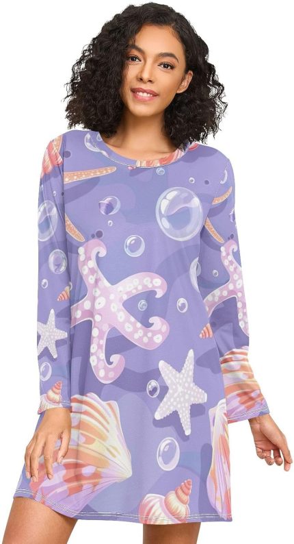 Cute Seashell Starfish Purple Long Sleeve Womens Sleep Shirts, Cozy Crewneck Sleep Dress, Lounge Womens Nightgown