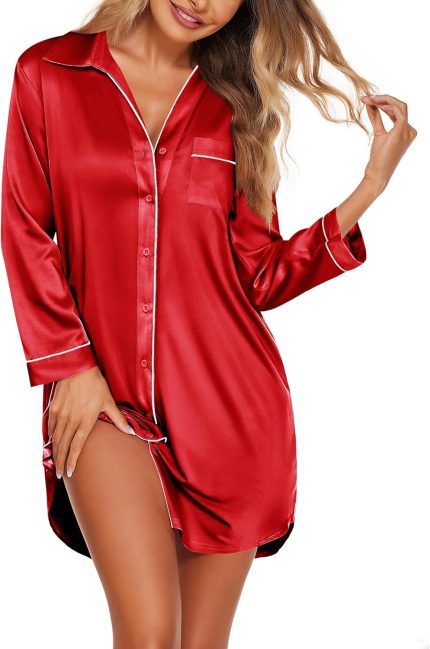 Ekouaer Satin Nightgowns for Women Button Down Sleep Shirt Silk Night Shirt Long Sleeve Boyfriend Sleepwear S-3XL Red