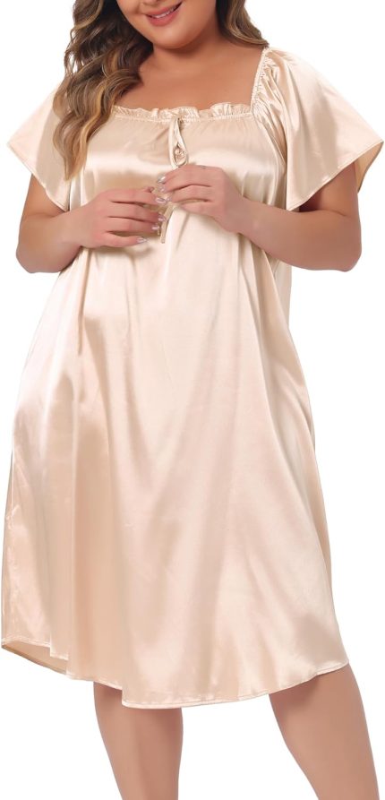 Agnes Orinda Plus Size Satin Silk Nightgown for Women Pleated Loose Sleepwear Nightshirt Sleep Dresses