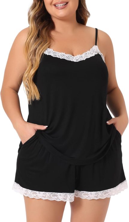 Agnes Orinda Plus Size Nightgown for Women Soft Lace Panel Elastic Waist Cami Sleep Lounge Pajama Sleepwear Set