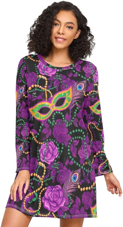 Floral Purple Long Sleeve Night Shirts for Women, Cozy Crewneck Sleep Dress, Loose Womens Nightgown