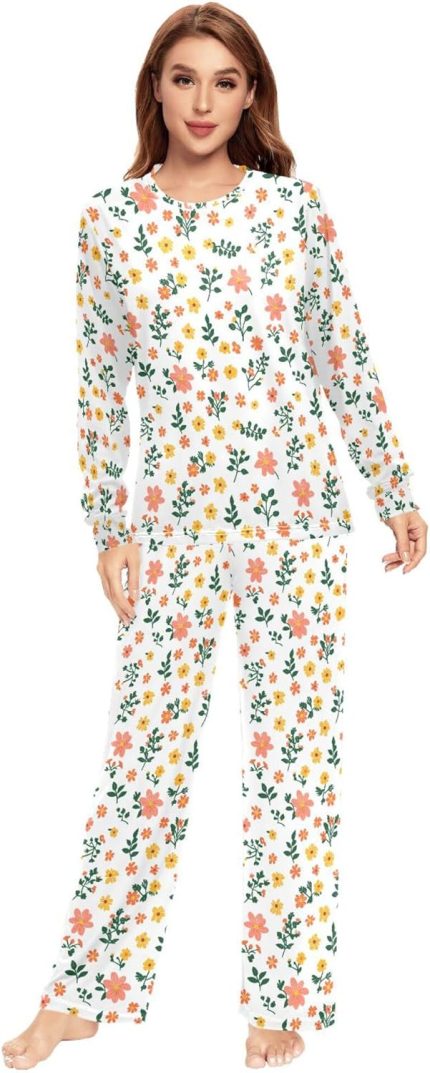 Flowers Orchid Zinnia Hosta White Pajama Sets for Women 2 Piece Warm Men Sleep Pants Nightgowns