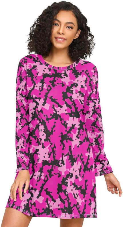 Hot Pink Bat Camo Womens Sleep Shirts, Long Sleeve Womens Nightgowns, Comfy Sleeping Clothes for Autumn