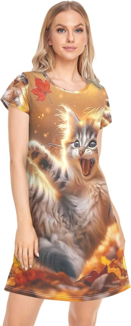Little Kitten Kung Fu Funny Nightgown for Women Animal Sleep Wear Short Nighties Shirts Dress, S