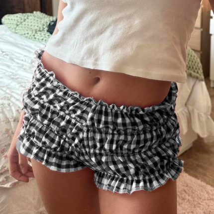 Lolita Bloomers Y2k Ruffle Lounge Mini Pj Shorts Women Low Rise Bow Lace Trim Gingham Sleep Pumpkin Pajamas Shorts