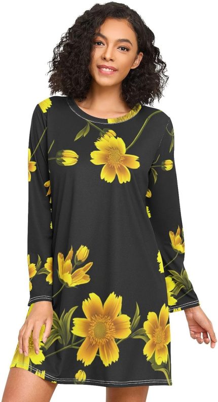Long Sleeve Night Shirts for Women, Cozy Crewneck Sleep Dress, Soft Womens Nightgown, Vibrant Yellow Flowers Black