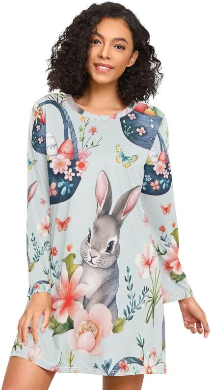 Long Sleeve Sleep Shirts for Women, Cozy Crewneck Sleep Dress, Casual Womens Nightgown, Vintage Rabbit Flower Blue