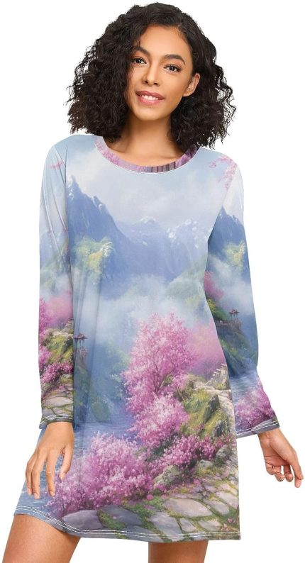 Long Sleeve Night Shirts for Women, Cozy Crewneck Sleep Dress, Casual Womens Nightgown, Oriental Mountain Waterfall