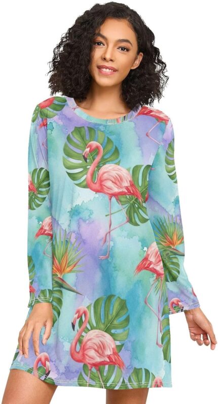Long Sleeve Sleep Shirts for Women, Cozy Crewneck Sleep Dress, Soft Womens Nightgowns, Flamingos