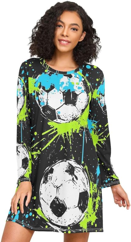 Long Sleeve Night Shirts for Women, Cozy Crewneck Sleep Dress, Comfy Womens Nightgown, Soccer Ball Splash