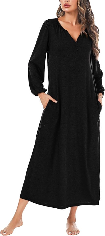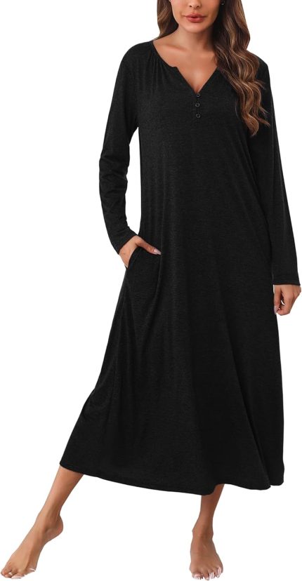 Marvmys Womens Cotton Long Sleeve Nightgown Long Sleepshirts Full Length Henley Sleep Dress with Pockets