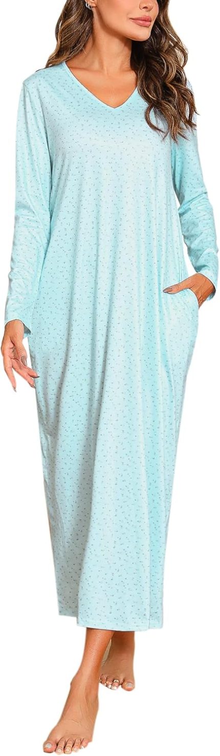 Marvmys Womens Cotton Long Sleeve Nightgowns Soft Ladies Sleep Shirts V Neck Full Length Night Shirts Sleepwear with Pockets