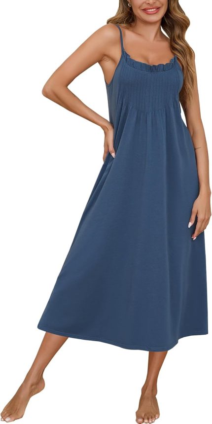 Marvmys Womens Cotton Sleeveless Nightgown Spaghetti Strap V Neck Full Slip Sleep Dress with Pockets