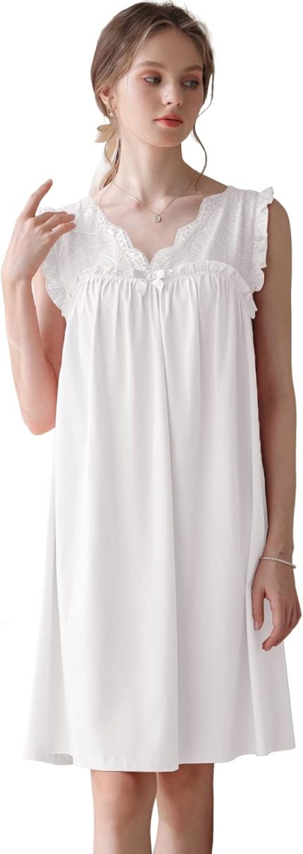 Nanxson Women’s Knitted Cotton Nightgown Sleepwear Sleeveless Sleep Dress V Neck Lace Nightwear Victorian Loungewear