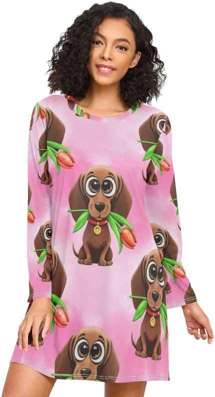 Nightgowns for Women, Soft Sleep Dress, Long Sleeve Night Shirts for Woman, Cute Dachshunds
