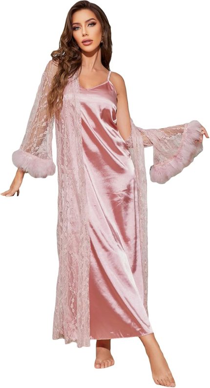 OYOANGLE Women’s 2 Piece Pajama Set Fuzzy Trim Lace Long sleeve Sleep Robe and Satin Cami Nightdress PJ Set Sleepwear