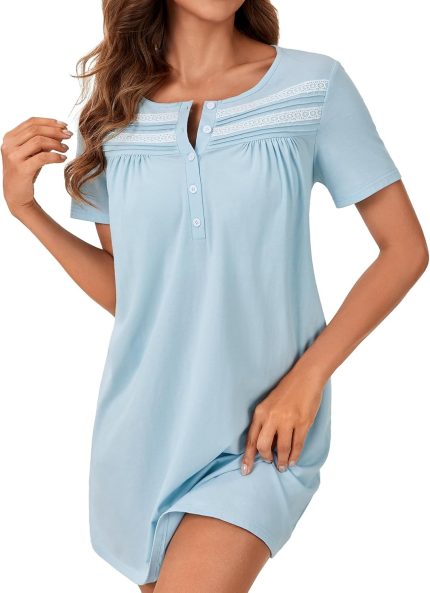 OPOIPIN Women’s Lace Trim Button Up Short Sleeve Nightgown Sleepwear Nightdress Sleep Shirt Dress