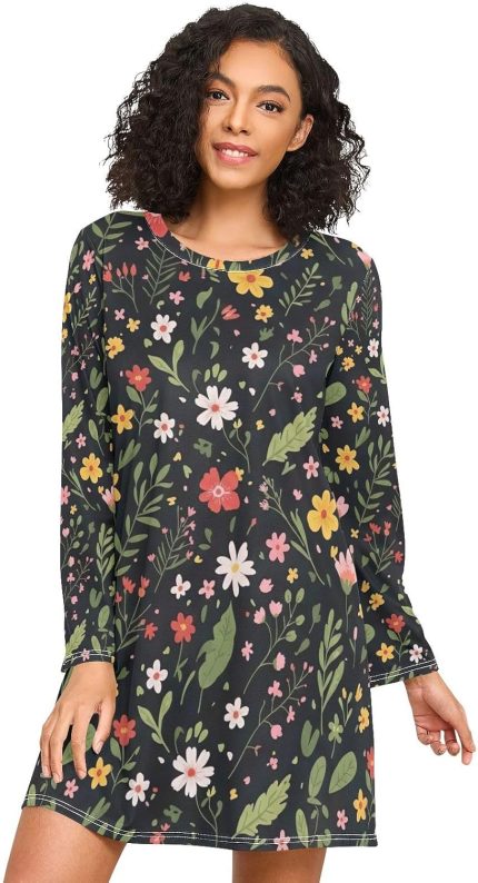 Whimsical Wildflowers Sleep Shirts for Women, Long Sleeve Womens Nightgowns, Soft Pajama Dress for Fall