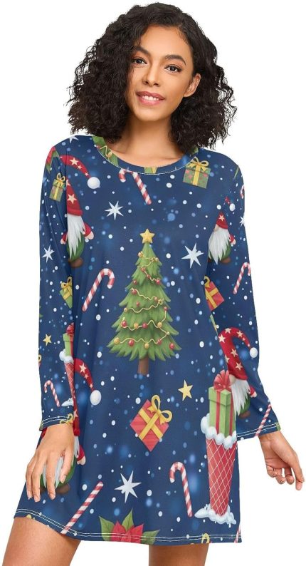 Whimsical Christmas Gnome Long Sleeve Womens Night Shirt, Cozy Crewneck Sleep Dress, Soft Womens Nightgowns