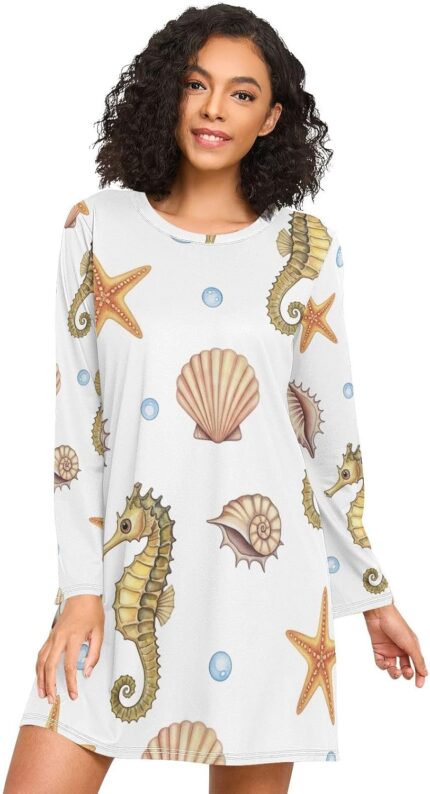 Watercolor Seahorses White Sleep Shirts for Women, Long Sleeve Womens Nightgown, Comfortable Sleeping Clothes for Fall