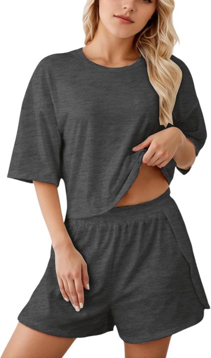 Women Casual Pajama Sets Soft Breathable Short Sleeve Crew Neck Top Loose Fit Shorts Comfort Loungewear Sleep Sets