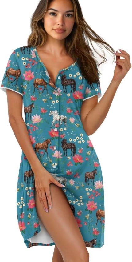 Women Button Nightgowns Short Sleeve Crew Neck Summer Sleep Dress Knee-Length Lounge Sleep Night Gown Housecoat