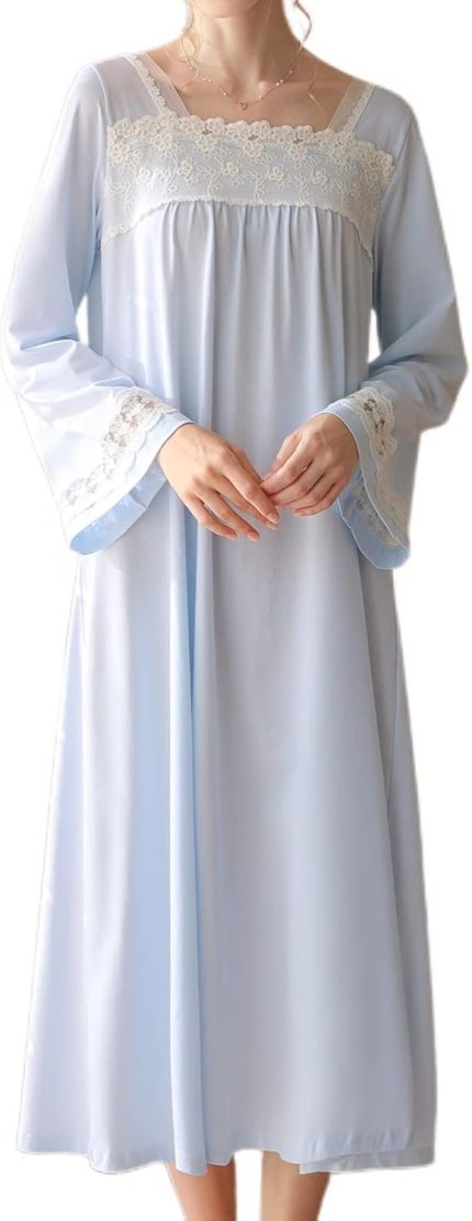 Women’s Cotton Blend Nightgown Victorian Vintage Sleep Dress Long Sleeve V Neck Full-length