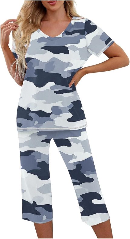 Women’s Funny Planets 2 Piece Matching Pajama Set Solar System Space Comfortable Night Shirts and Capris Sleep Sets