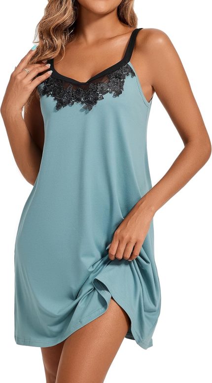 Women’s Cami Nightgown, Floral Print & Solid Color Sleep Dress, Lace – Trimmed Spaghetti Strap Nightwear
