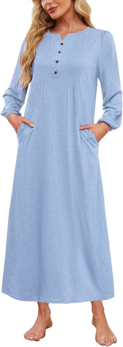 Womens Cotton Long Sleeve Nightgowns Soft Sleep Shirts V Neck Full Length Night Shirts Sleepwear with Pockets&Fake Buttons