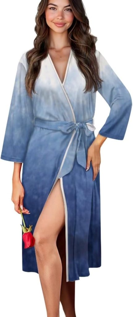 Women’s Long Sleeve Sleep Robe V-neck Long Nightgowns with Belt Breathable Loose Fit Bathrobe Plus Size Sleepwear