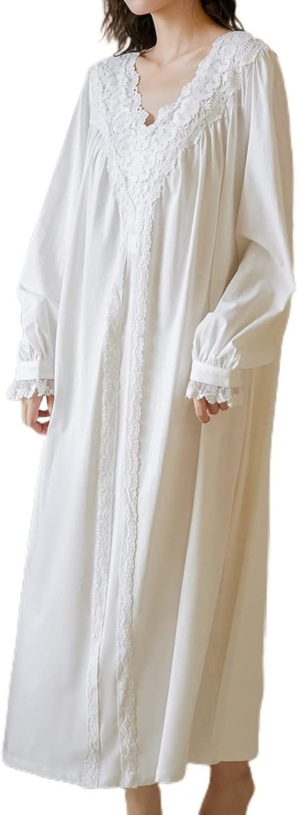 Women’s Victorian Nightgown Cute Cotton Lace Bishop Sleeve Sleep Shirt Long Pajama Dress Soft V Neck Sleepwear