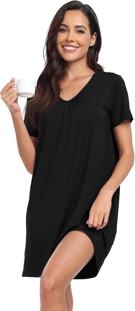 Women’s V Neck Sleep Shirts Built in Bra Nightgowns Short Sleeve Loose Sleepwear Dress Comfort Nightdress