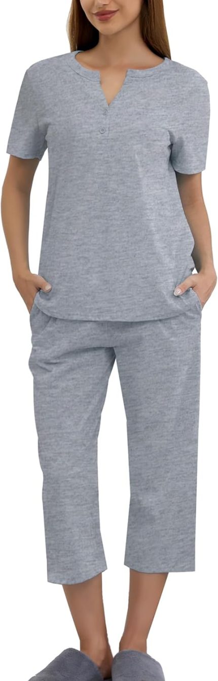 Womens Cotton Pajama Sets Short Sleeve Top With Pocketed Sleep Pants Sleepwear 2 piece sets for Women