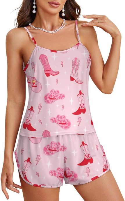Womens Cami Shorts Pajama Sets Retro Cowgirl Boots Hat Soft 2 Piece Pj Lounge Set Sleep Sleepwear