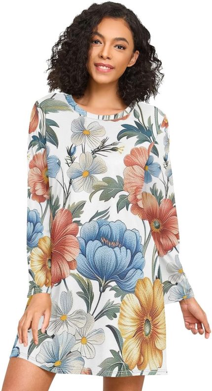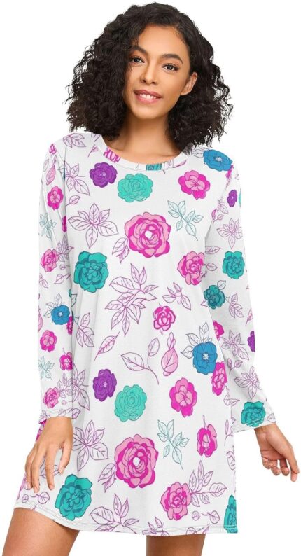 Womens Night Shirts, Long Sleeve Womens Nightgowns, Lounge Sleep Dress for Autumn, Colorful Roses Floral