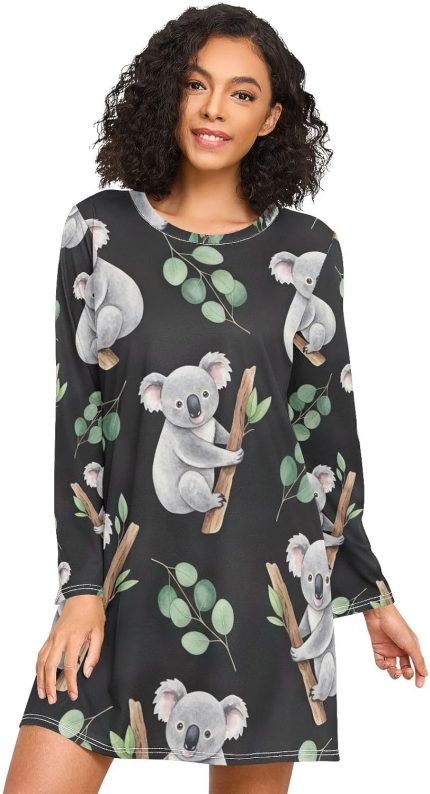 Womens Night Shirt, Long Sleeve Nightgowns for Women, Loose Sleep Dress for Fall Winter, Watercolor Koalas Black