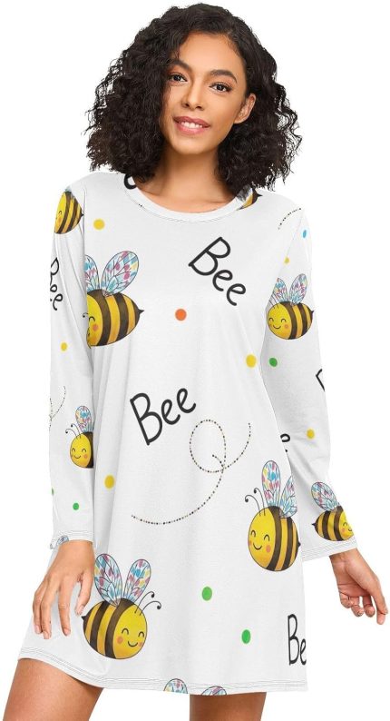 Womens Nightgown, Lounge Pajama Sleep Dress, Long Sleeve Night Shirts for Woman, Cute Bees White